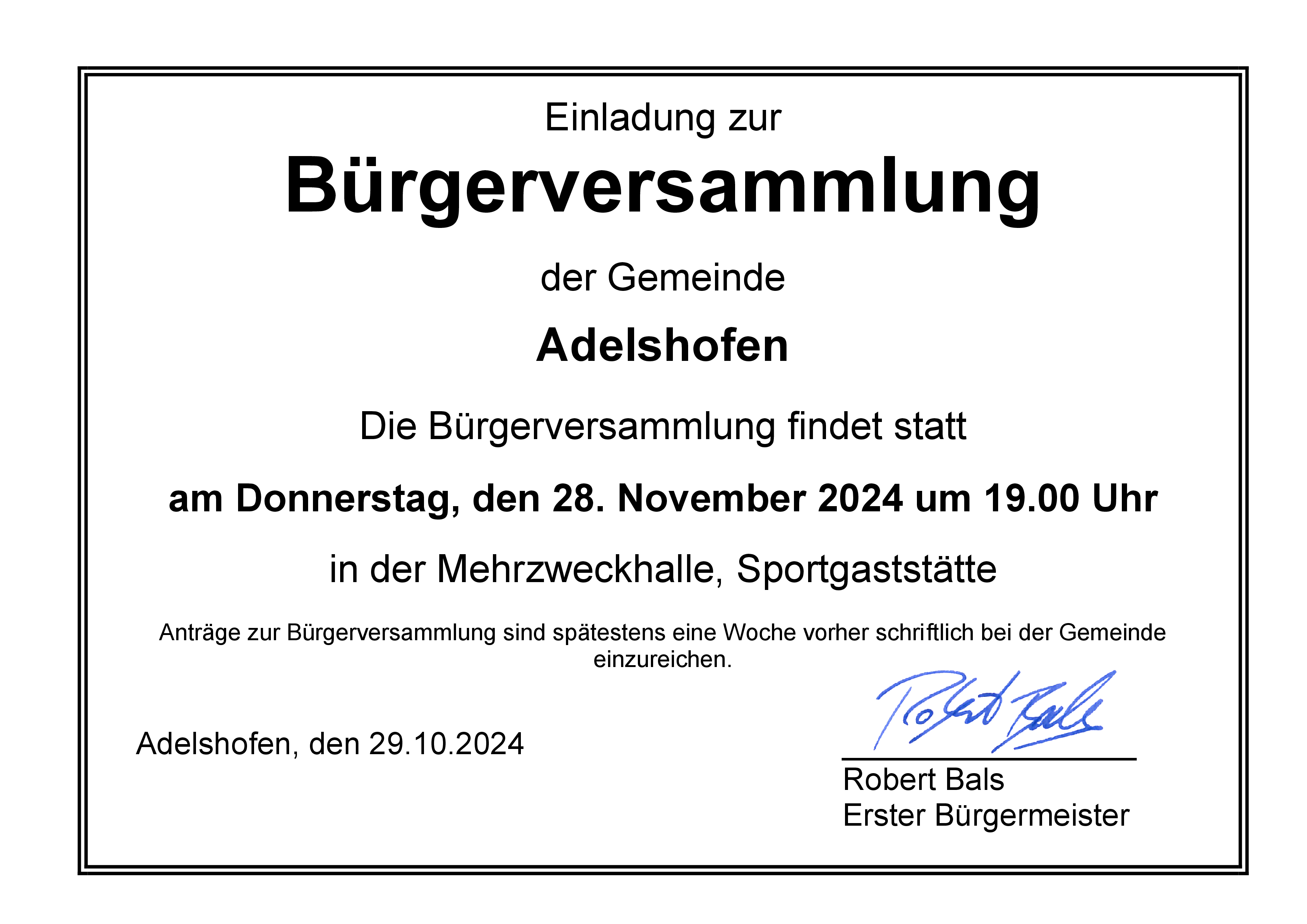 Am 28.11.2024 findet um 19 Uhr die Bürgerversammlung der Gemeinde Adelshofen in der Sportgaststätte statt.